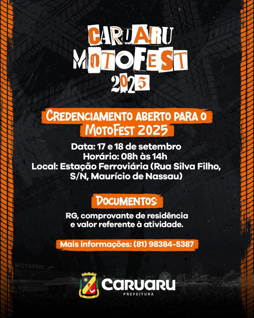 A partir desta quarta-feira (17), a Secretaria da Fazenda (SEFAZ) de Caruaru, vai realizar o credenciamento de comerciantes para o Motofest Caruaru 2025. O cadastro segue até e quinta-feira (18), na Estação Ferroviária, das 08h às 14h. Os interessados devem comparecer munidos de documento de identificação, comprovante de residência e do valor correspondente à atividade a ser cadastrada. O atendimento será feito mediante a distribuição de senhas, limitadas conforme a quantidade de vagas disponíveis para o evento.