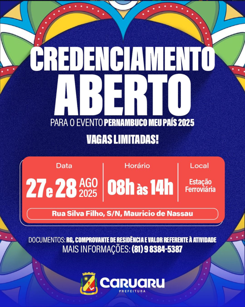 O Governo do Estado de Pernambuco, em parceria com a Fundação de Cultura de Caruaru (FCC) e a Secretaria Municipal da Fazenda (SEFAZ), realizará o credenciamento para comerciantes interessados em comercializar no evento Pernambuco Meu País 2025, que chegará em Caruaru no mês de setembro. O cadastro ocorrerá nestas quarta (27) e quinta-feira (28), das 08h às 14h, na Estação Ferroviária. Os contribuintes interessados devem comparecer ao local com brevidade, já que as vagas são limitadas. É necessário apresentar documentação pessoal, comprovante de residência e o valor referente à atividade de interesse comercial.