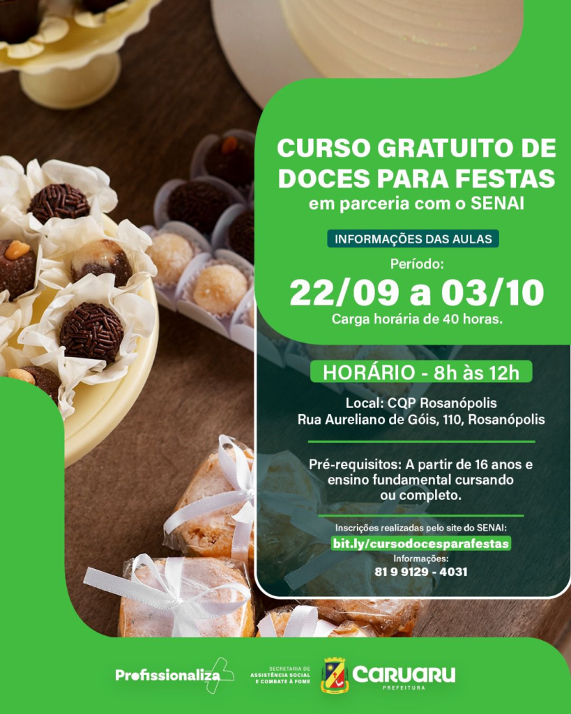 A Secretaria de Desenvolvimento Econômico, Turismo, Tecnologia e Economia Criativa de Caruaru (SEDETEC), em conjunto com a Secretaria Municipal de Assistência Social e Combate à Fome (SAS), abre inscrições para o curso de Doces para Festas, que integra o Programa Profissionaliza Mais Caruaru. O curso é voltado para pessoas maiores de 16 anos. A primeira turma será realizada no Centro de Qualificação Profissional Rosanópolis, localizado na Rua Aureliano de Góis, 110, no bairro Rosanópolis. As aulas acontecerão no turno da manhã, de 22 de setembro a 3 de outubro, com carga horária total de 40 horas. As inscrições podem ser feitas pelo site.