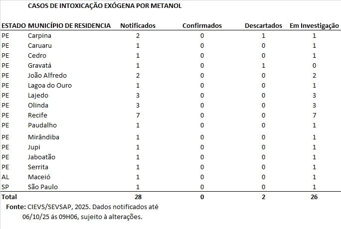 Ao todo, até o momento, a secretaria recebeu a notificação de 28 casos suspeitos de intoxicação por metanol, sendo dois pacientes residentes de outros estados (São Paulo e Alagoas). Deste quantitativo, 12 pacientes estão em acompanhamento em serviços de saúde, sete já receberam alta hospitalar, dois casos foram descartados (Gravatá e Carpina), 4 óbitos foram registrados (Lajedo 2, João Alfredo 1 e Paudalho 1) e três pacientes evadiram-se, abandonando o tratamento por conta própria.