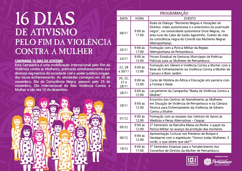 A Secretaria da Mulher de Pernambuco (SecMulher-PE) está promovendo, em Caruaru, um conjunto de ações para os 16 Dias de Ativismo pelo fim da Violência contra a Mulher. As atividades foram iniciadas na segunda-feira (20) – Dia Nacional da Consciência Negra – e seguirão até o dia 10 de Dezembro – Dia Internacional dos Direitos Humanos.