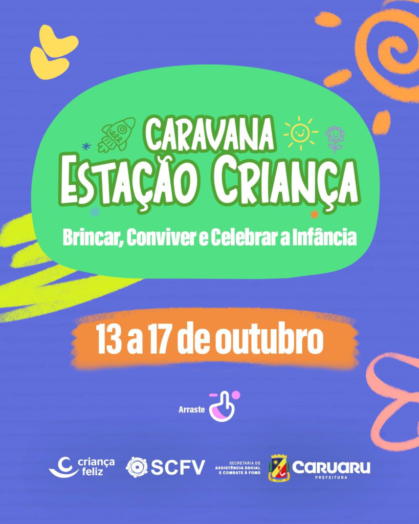 A Secretaria de Assistência Social e Combate à Fome de Caruaru realiza o projeto Caravana Estação Criança, em comemoração à Semana da Criança. A programação inclui estações temáticas com brincadeiras, oficinas criativas, apresentações musicais, teatro e show circense. As ações tiveram início hoje (13) e seguem até a próxima sexta-feira (17).