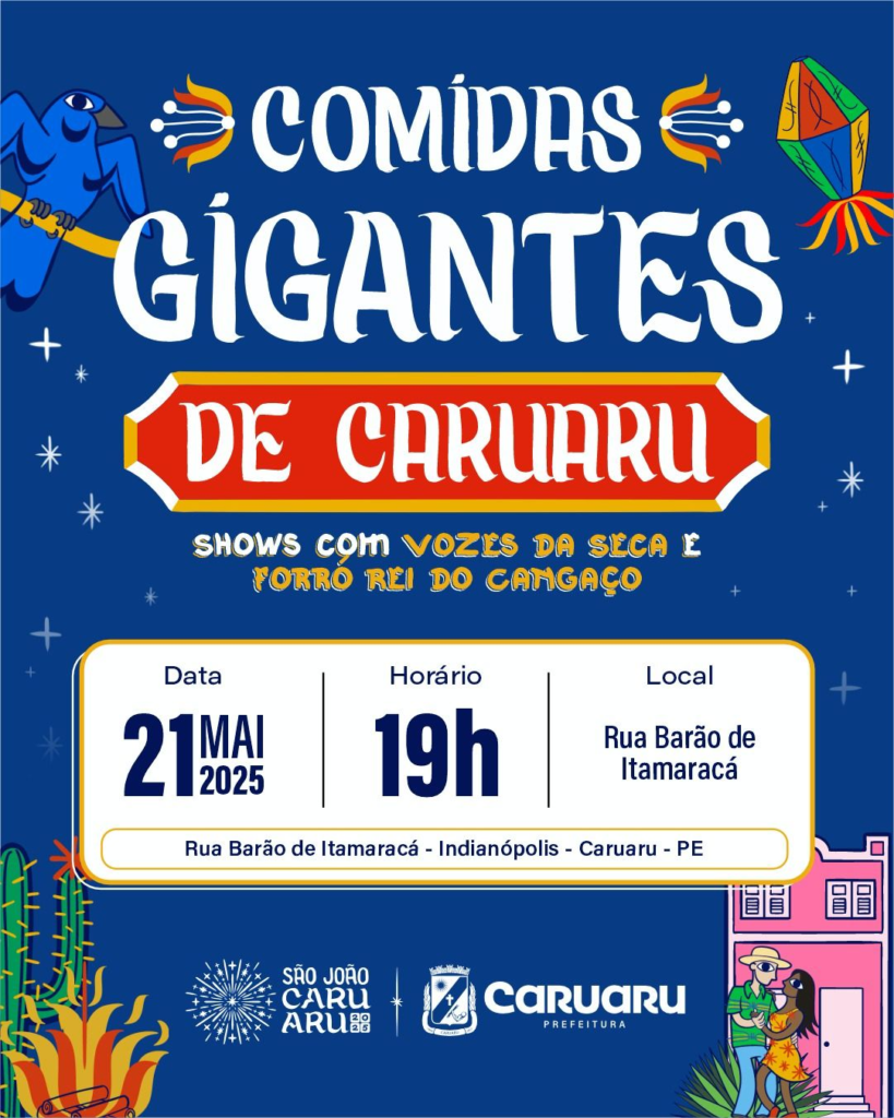 Caruaru celebra o encontro de 45 comidas gigantes nesta quarta-feira (21) , a partir das 19h, na Rua Barão de Itamaracá, no bairro Indianópolis. O evento contará com shows do Trio Vozes da Seca e do grupo Rei do Cangaço. O encontro deste ano tem o intuito de homenagear os 15 anos do Bolo de Milho Gigante.