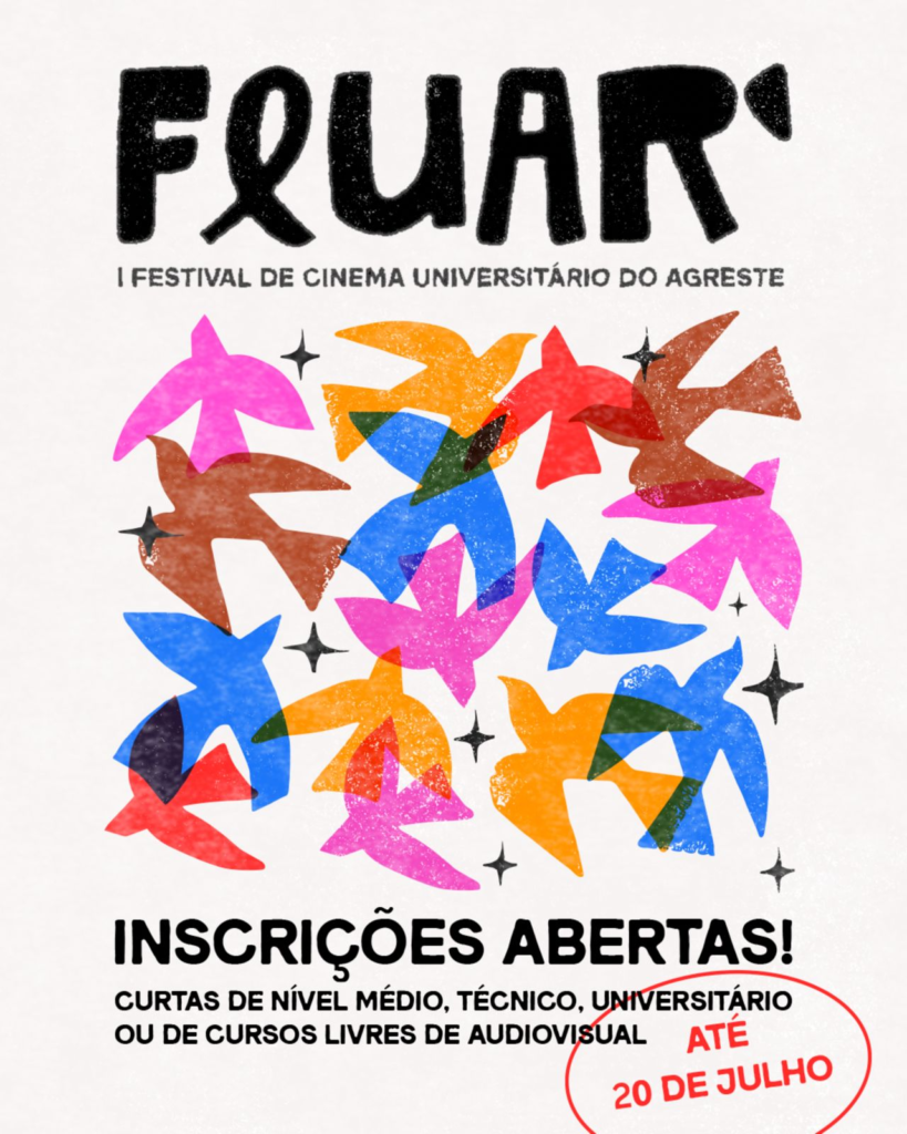 Caruaru sediará a primeira edição do Festival de Cinema Universitário do Agreste (FLUAR), entre os dias 09 a 12 de setembro deste ano, no Centro Cultural Tancredo Neves. O evento será gratuito. As inscrições para envio de curtas-metragens já estão abertas e seguem até o dia 15 de julho. Podem participar estudantes de todo o Brasil com filmes produzidos em contexto acadêmico e finalizados entre janeiro de 2023 e julho de 2025, através do formulário de inscrição: https://forms.gle/LZfcb5BG5c2gWZrP7 .