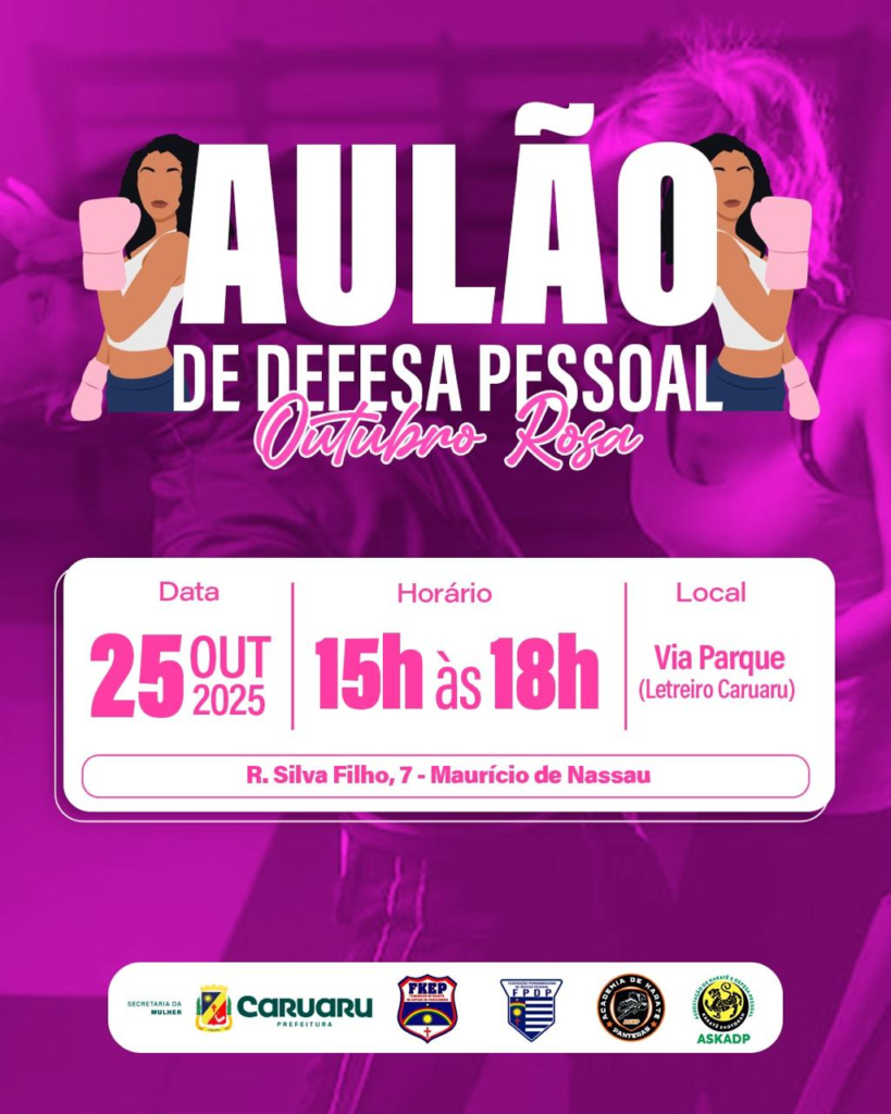A Via Parque receberá um aulão gratuito de defesa pessoal para mulheres neste sábado (25), a partir das 15h. O evento, que acontecerá nas proximidades do letreiro de Caruaru, será conduzido por instrutores especializados e contará com a parceria da Federação de Karatê Educacional de Pernambuco (FKEP), da Associação de Karatê Askanindpe, da Liga de Defesa Pessoal Feminina e da Associação de Karatê ASKADP.