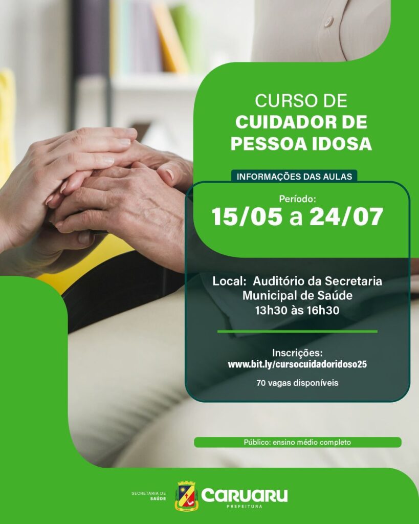 Estão abertas, em Caruaru, as inscrições para o curso de cuidador da pessoa idosa. A formação, realizada pela Secretaria Municipal de Saúde (SMS), já qualificou mais de 400 pessoas e faz parte de um plano de cuidado voltado à população idosa do município. As aulas terão início no dia 15 de maio e serão realizadas no auditório da Secretaria, das 13h30 às 16h30. Para se inscrever, os interessados devem preencher um formulário on-line.