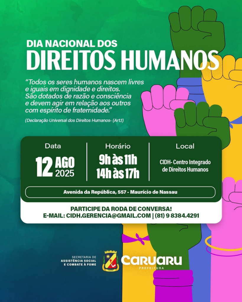 A Secretaria de Assistência Social e Combate à Fome de Caruaru, realiza uma programação especial em comemoração ao Dia Nacional dos Direitos Humanos, nesta terça-feira (12). A ação acontecerá no Centro Integrado de Direitos Humanos, localizado na Av. República, 557, no bairro Maurício de Nassau, a partir das 9h, e tem como objetivo promover um espaço de reflexão, diálogo e fortalecimento do compromisso coletivo com a dignidade, a igualdade e a justiça social.
