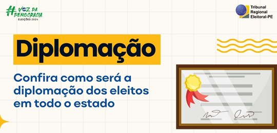 O Tribunal Regional de Pernambuco (TRE-PE) divulgou que a cerimônia de diplomação ocorrerá em Pernambuco entre os dias 6 de novembro e 19 de dezembro. O momento é dedicado para que a Justiça Eleitoral possa chancelar que o candidato ou a candidata foi efetivamente eleito ou eleita nos cargos de vereador, prefeito e vice-prefeito.