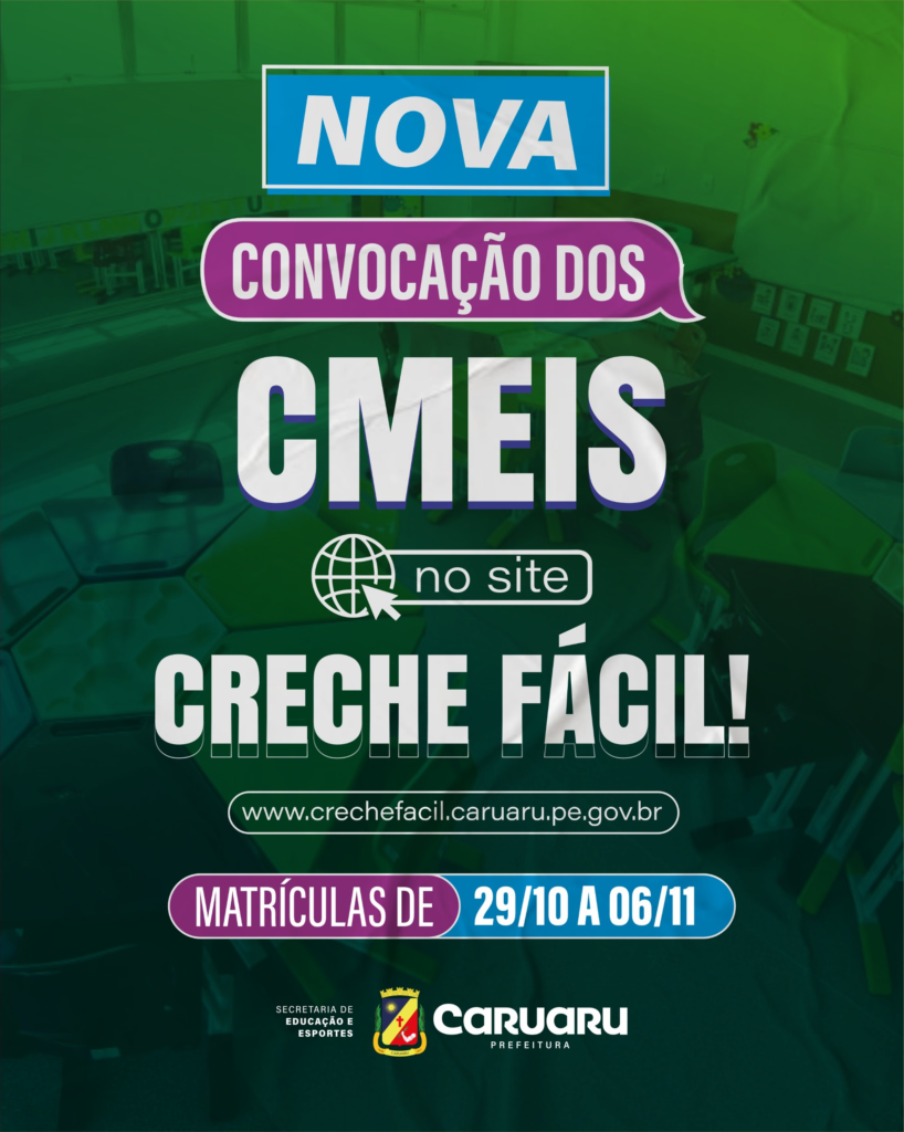 A Secretaria de Educação e Esportes, através do site oficial “Creche Fácil”, divulgou nova convocação de crianças contempladas com vagas nos Centros Municipais de Educação Infantil (CMEIs). O resultado está disponível através do endereço eletrônico: e pode ser consultado pelos responsáveis dos menores. O site “Creche Fácil” tem por objetivo ressaltar a transparência no processo de matrícula nas creches municipais. Os responsáveis devem efetivar as matrículas das crianças presencialmente na unidade contemplada, no período de 29 de outubro a 6 de novembro.