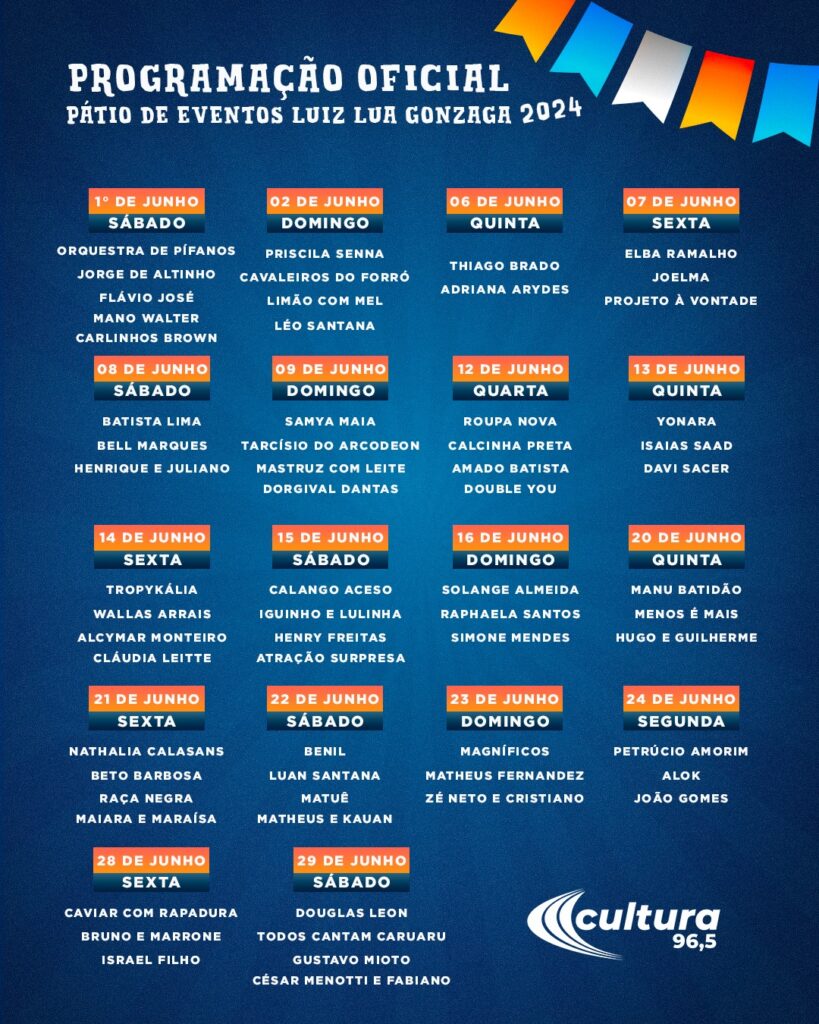 A programação divulgada hoje (19) tem ausência de artistas já carimbados na festa, como Wesley Safadão e Xandy Avião. Os cantores Nattan, Zé Vaqueiro, Mari Fernandez e Felipe Amorim também não constam na grade.