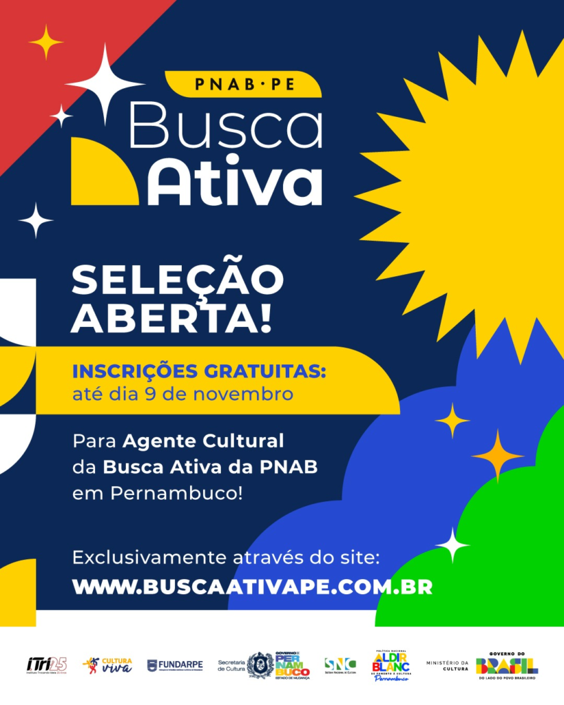 A Secretaria de Cultura de Pernambuco (Secult-PE) abriu seleção simplificada para contratar agentes culturais que vão atuar na Busca Ativa, ação focada nos editais do Ciclo 2 da Política Nacional Aldir Blanc (PNAB). As inscrições são gratuitas e ficam abertas até 9 de novembro, exclusivamente pelo site. A contratação contempla duas categorias: Agente de Busca Ativa, responsável por mobilização e orientação inicial nos territórios, e Agente de Balcão de Atendimento, com atendimento presencial e virtual, incluindo informações e auxílio aos proponentes.