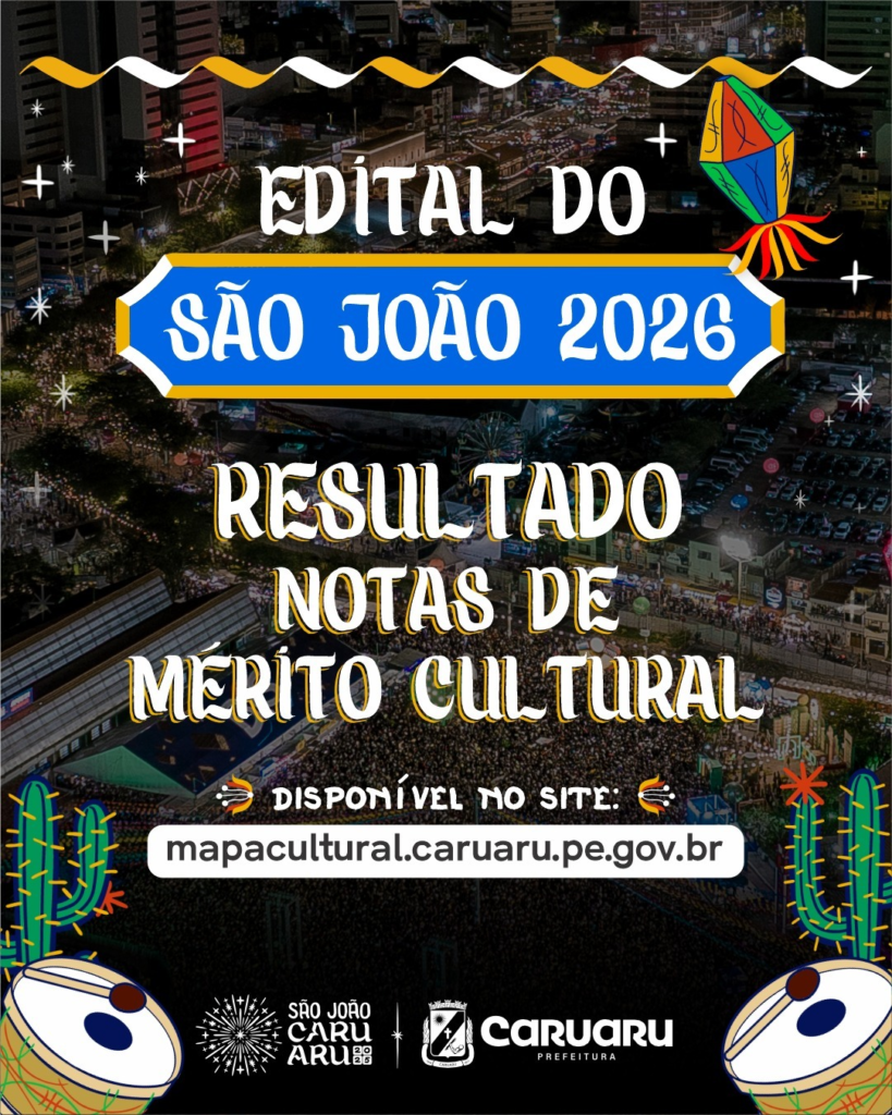 A Fundação de Cultura de Caruaru, divulgou no Diário Oficial desta segunda-feira (12), os resultados das notas de mérito cultural dos editais do São João 2026. O processo de avaliação foi realizado por meio de uma comissão composta por representantes da Fundação e do Conselho Municipal de Política Cultural. Ao todo, foram avaliadas 1.237 propostas, distribuídas em dois editais: um voltado para Música e outro para demais linguagens artísticas, incluindo Cultura Popular, Artes Integradas, Artes Urbanas, Artes Cênicas, Circo, Literatura, Artesanato, Audiovisual, Artes Visuais, Design e Moda, Fotografia, Patrimônio Cultural, Povos Tradicionais, Dança e Gastronomia.