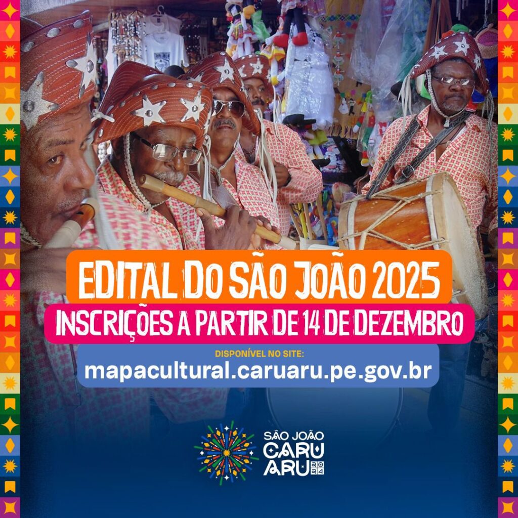 Os editais do São João 2025 de Caruaru foram lançados pela Fundação de Cultura na última sexta-feira (13). O período de inscrição teve início no último sábado (14), e seguirá até às 16h59 do dia 17 de janeiro de 2025. Os interessados deverão realizar suas inscrições, de forma exclusiva, por meio da plataforma Mapa Cultural. Vale mencionar que haverá cotas para pessoas pretas, pardas, povos indígenas e tradicionais, e pessoas com deficiência.