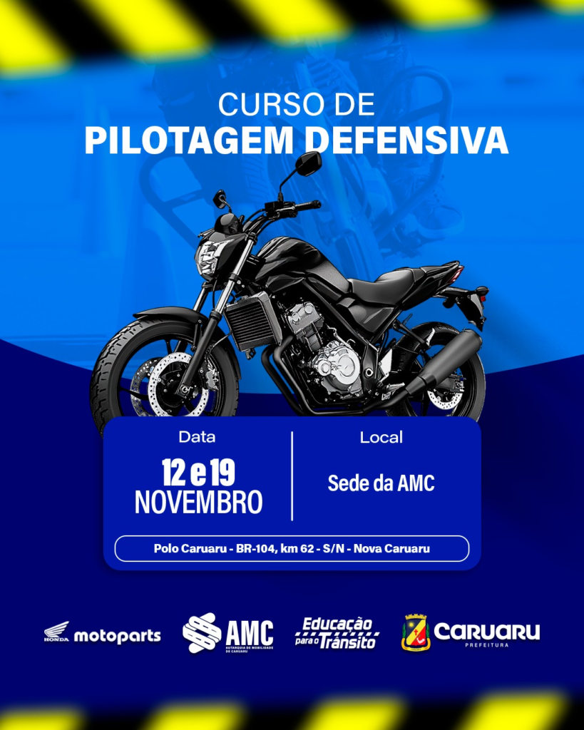 A Autarquia de Mobilidade de Caruaru (AMC) oferta um curso gratuito de pilotagem defensiva para motociclistas neste mês de novembro, nos dias 12 e 19, das 8h às 17h. O curso será realizado na sede da Autarquia, localizada no Polo Caruaru, às margens da BR-104, KM 62, bairro Nova Caruaru. As inscrições estão abertas e podem ser realizadas por meio de formulário on-line disponível neste link. Os motociclistas inscritos no curso devem comparecer com a motocicleta própria.