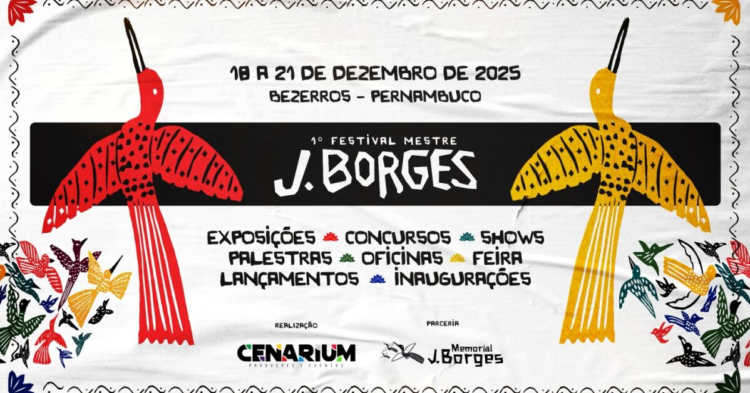 A Organização do 1º Festival Mestre J. Borges divulgou a programação completa do evento, que será realizado entre os dias 18 a 21 deste mês, em Bezerros. O festival, que é gratuito e aberto ao público, presta homenagem ao mestre xilogravurista e cordelista bezerrense J. Borges, falecido em julho de 2024, conta com uma vasta programação cultural que engloba shows artísticos com artistas locais e regionais, exposições, oficinas culturais, feira de artesanato, concursos de xilogravura e cordel, visitas guiadas, rodas de conversas, entre outras atividades. A programação completa pode ser acessada pelo Instagram oficial do evento: @festivaljborges
