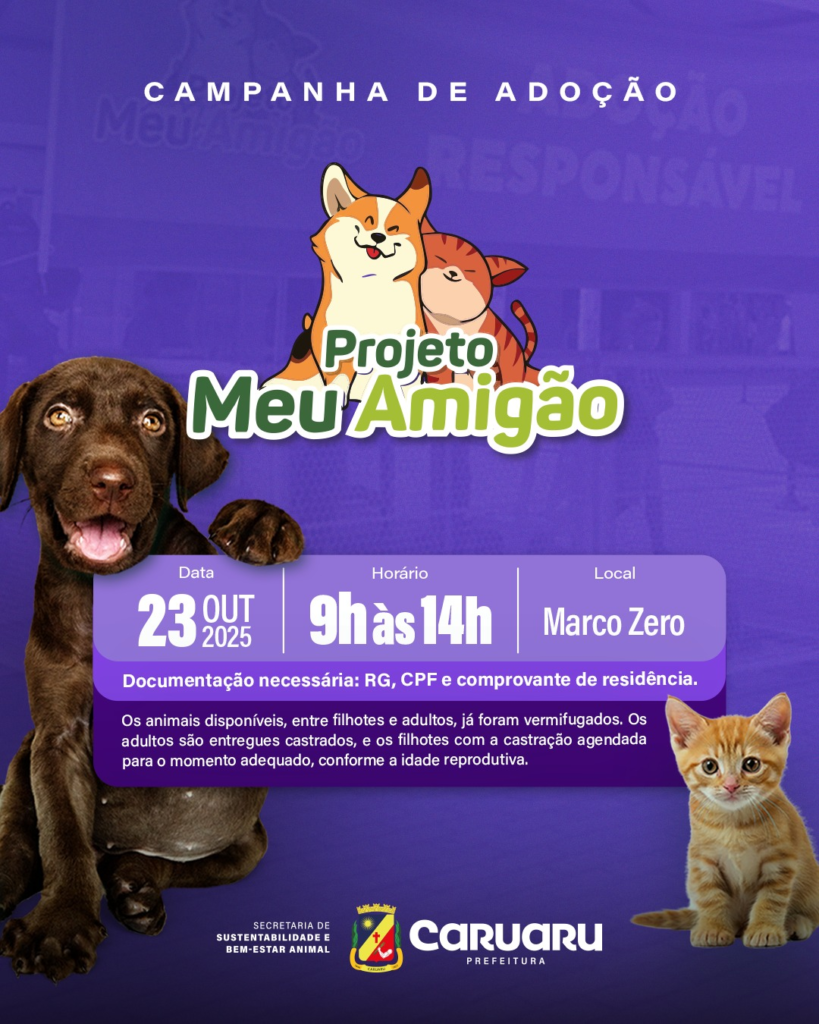A Secretaria de Sustentabilidade e Bem-Estar Animal de Caruaru realiza, hoje (23), mais uma edição do projeto “Meu Amigão”, que promove a adoção responsável de cães e gatos resgatados pela AME Animal. A ação é realizada no Marco Zero, de segue até às 14h, reunindo pets devidamente vacinados e vermifugados. Os interessados em adotar precisam ser maiores de 18 anos, apresentar RG, CPF, comprovante de residência e assinar um termo de responsabilidade.
