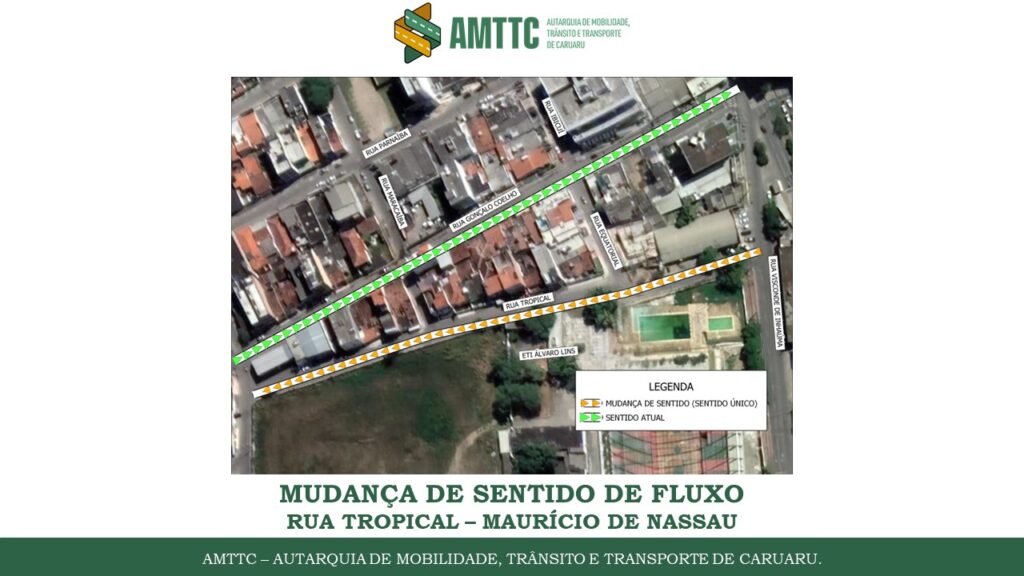 A partir desta quarta-feira (26), a rua Tropical, localizada no bairro Mauricio de Nassau passa a ter sentido único. Agora, o fluxo da via é no sentido rua Visconde de Inhaúma/Posto de Gasolina. A rua Tropical fará parte de um binário com a rua Gonçalo Coelho.
