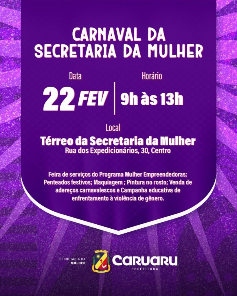 Amanhã (22), a partir das 9h, estará acontecendo o Carnaval da Secretaria da Mulher de Caruaru (Semu). O evento une folia com a oferta de diversos serviços para as mulheres que vão aproveitar o Pré-Carnaval Multicultural. A ação estará acontecendo até às 13h, no térreo da SEMU, na Rua dos Expedicionários, nº 30, no Centro.