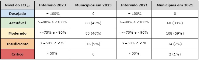 De acordo com o estudo, 91% dos municípios pernambucanos estão nos níveis aceitável ou moderado do índice. Em relação à edição anterior (2021), o TCE-PE registrou um aumento de 40% das cidades classificadas no nível aceitável. Além disso, caiu a zero o número de municípios em estágio crítico. Da mesma forma, nenhum atingiu o grau desejável na pesquisa.